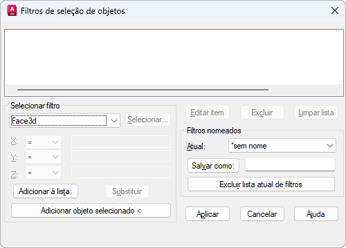Sai da caixa de diálogo e exibe o prompt Select Objects, na qual é criado um conjunto de seleção. O filtro atual é utilizado nos objetos que você selecionar.