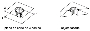 O plano de corte é definido com 2 ou 3 pontos, ao especificar um plano principal do UCS ou ao selecionar um objeto de superfície ou plano (mas não uma malha). É possível manter um lado ou os dois lados dos sólidos fatiados.