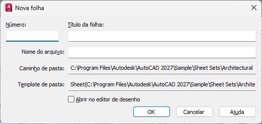 Especifica o nome do novo arquivo de desenho contendo a folha. Por padrão, o nome do arquivo de desenho é o número da folha combinado com o título da folha. O nome do arquivo de desenho também pode ser alterado nesta caixa.