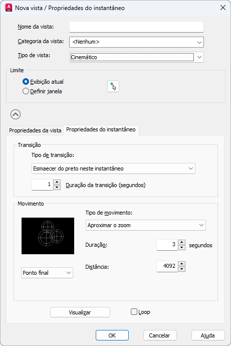 Define a distância que o movimento leva para concluir quando a vista nomeada é atribuída ao tipo de vista Cinematic.