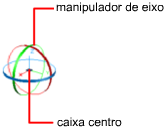 Depois que você selecionar os objetos e sub-objetos que deseja rotacionar, a meta-alça 3D é exibida no centro do conjunto de seleção. A caixa central (ou alça base) da meta-alça define o ponto base para o movimento e temporariamente altera a posição do UCS enquanto você move os objetos selecionados.
