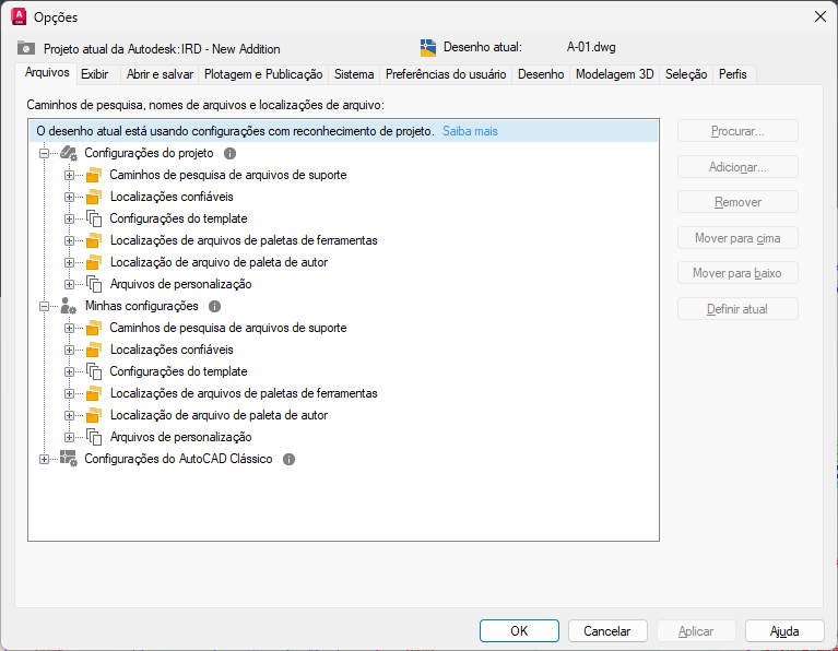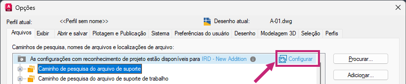 Nota: Se você não vir a opção Configurar, o projeto poderá já ter sido configurado anteriormente. Isso pode ser verificado pela exibição do texto “O desenho atual está usando configurações com reconhecimento de projeto”.