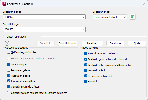 Por exemplo, se você tiver diversas peças parecidas no desenho, mas precisar alterar todas elas para 4384K61, insira 4384K6? na caixa Localizar e 4384K61 na caixa Substituir.