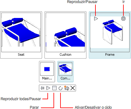 Quando um instantâneo é criado, é possível reproduzir a animação atribuída a ele, utilizando os controles de vista localizados em cada instantâneo ou sequência de instantâneos e o controle do ShowMotion. Os controles de vista disponíveis são: