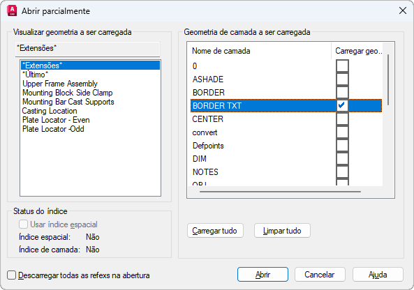 Você pode selecionar e carregar a geometria de uma vista ou área selecionada e de camadas. Não é possível descarregar nenhuma informação que esteja atualmente carregada no desenho. Se o desenho contiver refex anexadas não carregadas no momento em que o desenho foi parcialmente aberto, você poderá recarregar as refex utilizando a paleta External References. Consulte REFEX.