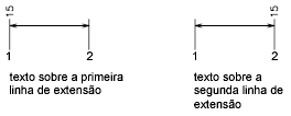 O texto é posicionado dentro das linhas de extensão somente se os segmentos resultantes tiverem no mínimo o mesmo comprimento da lacuna do texto. O texto acima ou abaixo de linha de cota é posicionado dentro somente se pontas de seta, texto de cota e a margem deixam espaço suficiente para o espaçamento do texto. (variável de sistema DIMGAP)