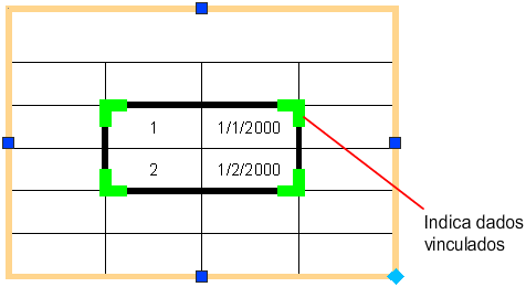 Uma tabela que contém vínculos de dados exibe indicadores em torno das células vinculadas. Se você passar o cursor sobre o vínculo de dados, as informações sobre o vínculo de dados serão exibidas.