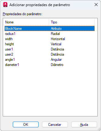 Exibe os nomes dos parâmetros disponíveis para adicionar na tabela de propriedades do bloco.