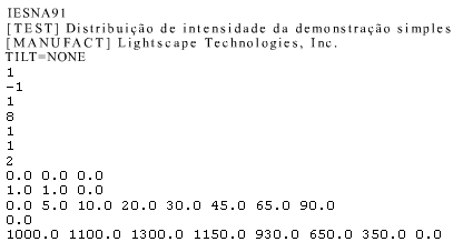 É possível criar um arquivo de dados fotométricos no formato de arquivo padrão IES (Illuminating Engineering Society) LM-63-1991 para dados fotométricos.