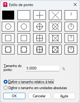 Define o tamanho da exibição do ponto. O valor inserido pode ser relativo à tela ou em unidades absolutas. O ponto exibido é armazenado na variável de sistema PDSIZE. Os objetos ponto subsequentes que você desenhar utilizarão o novo valor.