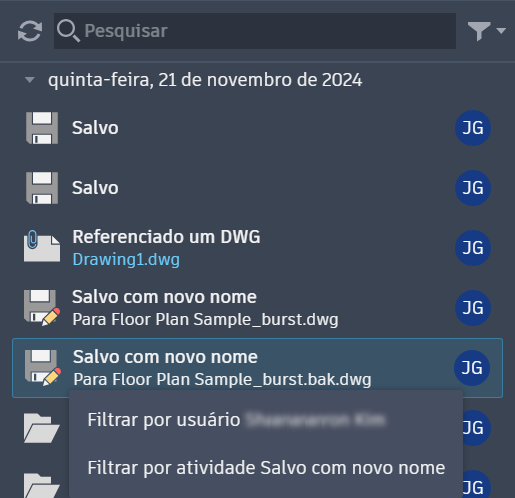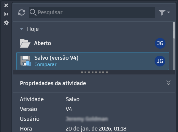 Nota: No momento, o AutoCAD LT exibe somente a atividade da versão na paleta Informações de atividade.