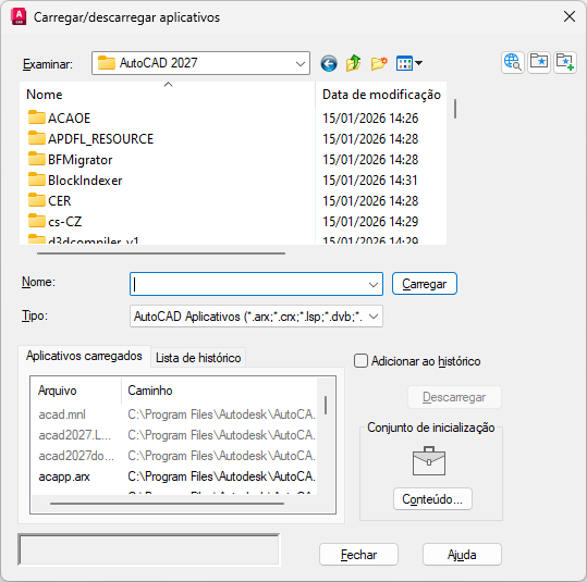 Se você selecionar um arquivo que já tenha sido carregado, Carregar recarregará o aplicativo quando aplicável. Você não poderá recarregar os aplicativos ObjectARX. Nesse caso, será necessário primeiro descarregar o aplicativo ObjectARX e, em seguida, carregá-lo novamente. A opção Carregar estará também disponível em um menu de atalho exibido ao clicar com o botão direito do mouse em um arquivo na guia Lista de histórico.