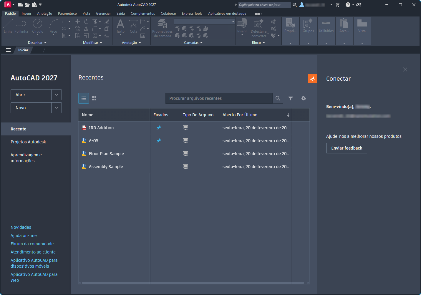 A guia Início é exibida por padrão na inicialização, fornecendo acesso fácil a uma variedade de ações iniciais, incluindo o acesso aos arquivos de templates de desenho, desenhos e conjuntos de folhas recentemente abertos, opções de aprendizado on-line e comunicados.