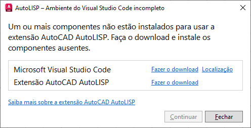 Se LISPSYS estiver definida com um valor diferente de zero, o AutoCAD verificará se o Visual Studio Code e a Extensão do AutoCAD AutoLISP foram instalados. Se o Visual Studio Code não estiver instalado, a seguinte caixa de mensagem será exibida.