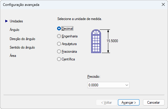 O assistente Advanced Setup contém cinco páginas: Units, Angle, Angle Measure, Angle Direction e Area. Ao trabalhar nesse assistente, escolha Back e Avançar para navegar nas telas. Para fechar o assistente e criar o novo desenho com as configurações especificadas, escolha Finish na última tela.