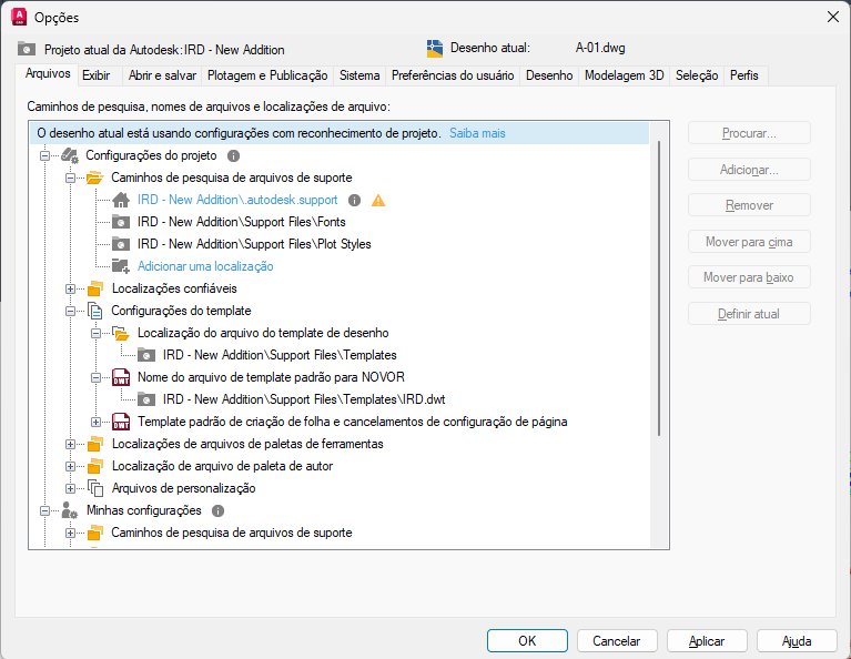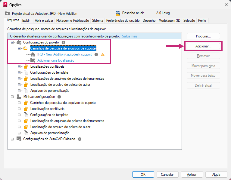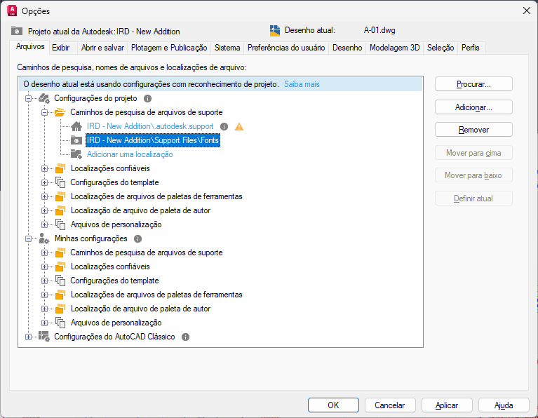 Depois que um projeto da Autodesk no Forma Data Management tiver sido configurado para usar Arquivos de suporte conectados, será possível definir ou alterar os caminhos dessas configurações. Os caminhos são pesquisados na ordem em que são listados. Se o mesmo arquivo for encontrado em várias pastas, será usada a primeira instância encontrada. As configurações em Configurações do projeto têm precedência sobre Minhas configurações e Configurações do AutoCAD clássico.