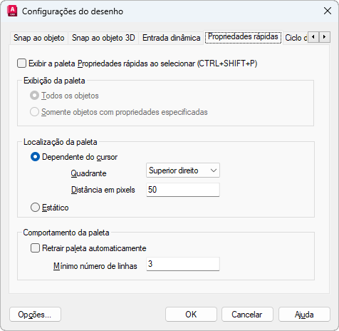 Especifica qual dos quatro quadrantes relativamente ao cursor exibirá a paleta Propriedades rápidas com relação à localização do cursor. A localização padrão é acima e à direita do cursor.