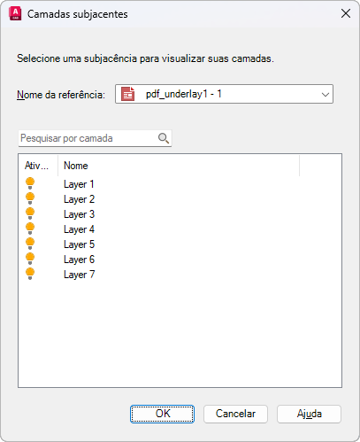 Use os comandos CAMADASDWF, CAMADASPDF, CAMADASDGN ou CAMADASSUBJ ou clique com o botão direito do mouse em uma subjacência selecionada e clique em Camadas no menu de atalho.