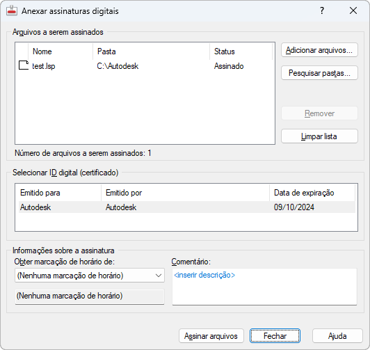 Anexa uma assinatura digital a todos os arquivos relacionados nessa caixa de diálogo.
