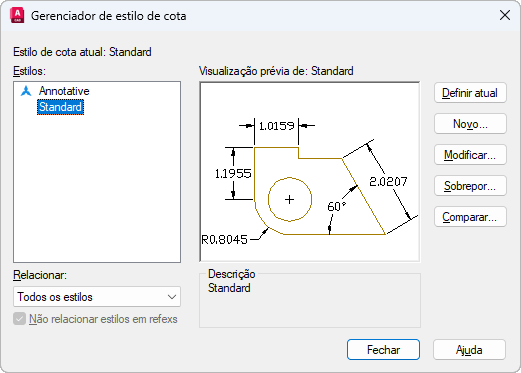 Lista estilos de cota no desenho. O estilo atual é destacado. Clique com o botão direito na lista para exibir um menu de atalho que você pode utilizar para definir o estilo atual, renomear estilos e excluir estilos. Você não pode excluir um estilo que é atual ou está em uso no desenho atual.