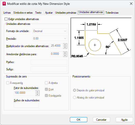Especifica a exibição de unidades alternativas em medidas de cotas e define o seu formato e a sua precisão.