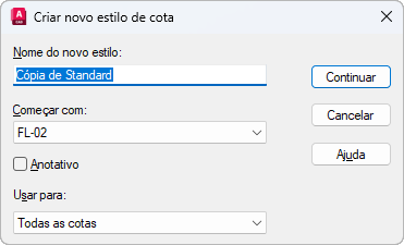 Nomeia o novo estilo de cota, define o estilo no qual iniciar um novo estilo e indica os tipos de cota aos quais você deseja que o novo estilo seja aplicado.