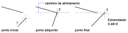 Por padrão, o rastreamento de snap ao objeto está definido como ortogonal. Os caminhos de alinhamento são exibidos em 0, 90, 180 e 270 graus a partir dos pontos de objeto obtidos. Entretanto, você pode utilizar ângulos de rastreamento polar. Para o rastreamento de snap ao objeto, os pontos de objeto são automaticamente adquiridos.