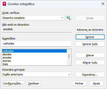 Verifica a ortografia em texto de linha única, texto com múltiplas linhas, texto de linha de chamada múltipla, texto nos atributos do bloco, texto em refex e texto adicionado em cotas.