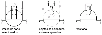 É possível aparar objetos de forma que eles terminem precisamente nas arestas dos objetos selecionados. Um objeto também pode ser um dos limites de recorte e um dos objetos a serem aparados. Por exemplo, na instalação de iluminação ilustrada, o círculo é uma aresta de recorte para as linhas de construção e está também sendo aparado.