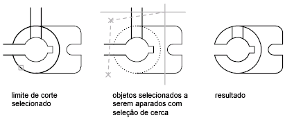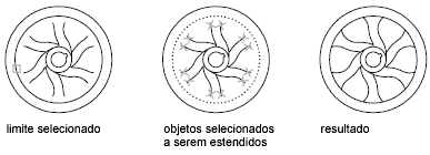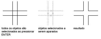 Após iniciar os comandos APARAR ou ESTENDER, basta selecionar os objetos perto das extremidades a serem aparadas ou estendidas. Existem três opções padrão para selecionar os objetos: