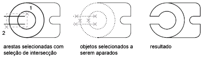 Quando usa o Modo padrão, os objetos que você seleciona como limites de recorte ou arestas de limite não precisam fazer intersecção com o objeto que está sendo aparado. Você pode aparar ou estender um objeto até uma aresta projetada ou até uma interseção extrapolada; isto é, onde os objetos fariam interseção se eles fossem estendidos.