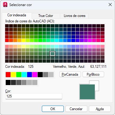 É possível selecionar entre as 255 cores do Índice de cores do AutoCAD (ACI), true colors e cores do Livro de cores disponíveis em três guias.
