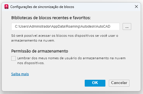 O botão Configurações de sincronização de blocos na parte inferior da Paleta de blocos é dinâmico e indica se os blocos recentes e favoritos são sincronizados em um armazenamento na nuvem.