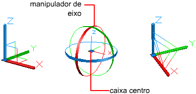 Por padrão, a alça é inicialmente colocada no centro do conjunto de seleção. No entanto, é possível realocar a alça para qualquer lugar no espaço 3D. A caixa central [ou alça base] da alça define o ponto base para a modificação. Este comportamento é equivalente a alteração temporária da posição do UCS enquanto você move ou rotaciona os objetos selecionados. Os manipuladores de eixos na alça restringe o movimento ou rotação para um eixo ou plano.