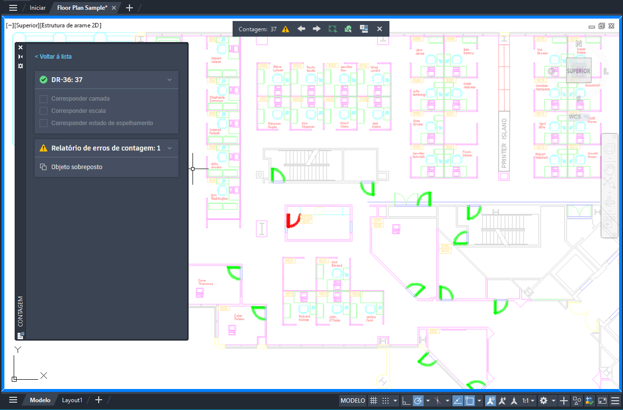 A paleta Contagem exibe os nomes dos blocos e a contagem correspondente de cada bloco. Quando você estiver em uma contagem ativa, a paleta Contagem exibe os detalhes da contagem, incluindo o relatório de erros, se houver. O relatório lista os erros de contagem, como objetos sobrepostos, explodidos ou renomeados. Clique no erro de contagem para aumentar o zoom e verificar o objeto.