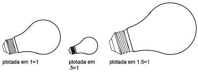 Em geral, os objetos são desenhados em seu tamanho real. Isto é, você decide como interpretar o tamanho de uma unidade (uma polegada, um milímetro, um metro) e desenha em uma escala 1:1. Por exemplo, se a unidade de medida for milímetro, cada unidade no desenho representará um milímetro. Ao plotar o desenho, você especifica uma escala precisa ou ajusta a imagem ao papel.