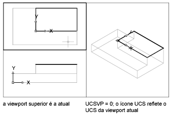 Por exemplo, você pode definir três viewports: uma visualização superior, uma visualização frontal e uma visualização isométrica. Se definir a variável de sistema UCSVP como 0 na viewport isométrica, você poderá utilizar o UCS superior na viewport superior e na viewport isométrica. Quando você define a viewport superior como atual, o UCS da viewport isométrica reflete a viewport superior do UCS. Da mesma forma, tornar a viewport frontal atual alterna o UCS da viewport isométrica para corresponder ao UCS da viewport frontal.