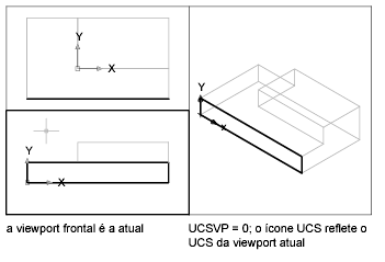O UCS em cada viewport é controlado pela variável de sistema UCSVP, que também pode ser acessada com o comando GERUCS, na guia Configurações. Quando UCSVP está definida como 1 em uma viewport, o último UCS utilizado nessa viewport é salvo com ela e restaurado quando a viewport é definida novamente como atual. Quando UCSVP estiver definida como 0 em uma viewport, seu UCS será sempre o mesmo que o UCS da viewport atual.
