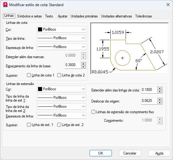 Define o formato e as propriedades das linhas de cota, linhas de extensão, pontas de seta e marcas de centro.