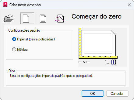 Start from Scratch cria um novo desenho com as configurações padrão imperial ou métrica. Use a Template cria um novo desenho com as configurações definidas em um template de desenho selecionado. Use a Wizard cria um novo desenho com as configurações especificadas no assistente Quick ou Advanced. (A primeira opção, Abrir um desenho, não fica disponível a partir do comando NOVO. Para abrir um desenho existente, utilize ABRIR.)