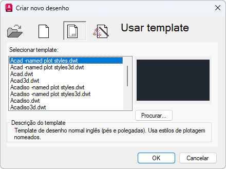 Exibe uma descrição do template selecionado. Se você cria seu próprio template, poderá usar a caixa de diálogo Opções do template para especificar o que deseja exibir aqui. Consulte o comando SALVARCOMO.