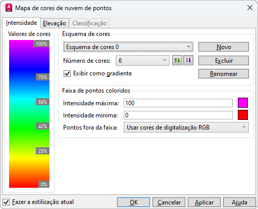 Edita as configurações do esquema de cores para estilizações da nuvem de pontos Intensidade.