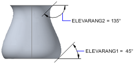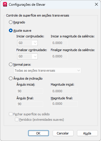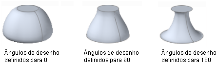 Controla o ângulo de inclinação e a magnitude da primeira e da última seção transversal do sólido ou da superfície elevada. O ângulo de inclinação está na direção inicial da superfície. 0 é definido como o exterior de um plano de curva. (variável de sistema LOFTNORMALS)