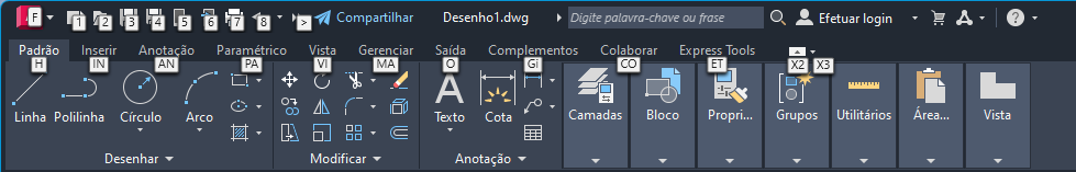 É possível utilizar teclas em vez do dispositivo apontador para fazer seleções em menus, a barra de ferramentas de acesso rápido e faixa de opções. Para saber quais teclas estão disponíveis no espaço de trabalho atual, pressione a tecla Alt.