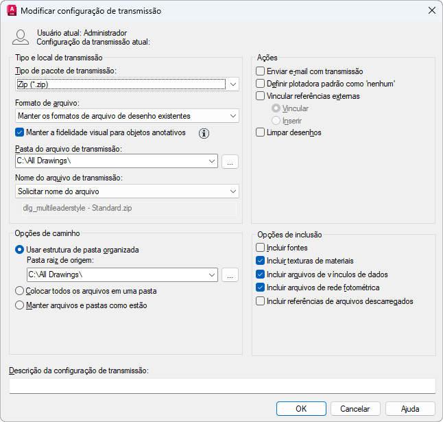 Se este campo não for modificado, o arquivo de transmissão é criado na pasta que contém o arquivo de desenho especificado. Em um contexto de conjunto de folhas, o arquivo de transmissão é criado na pasta contendo o arquivo de dados de definição de folha (DST). Não se aplica ao AutoCAD LT.