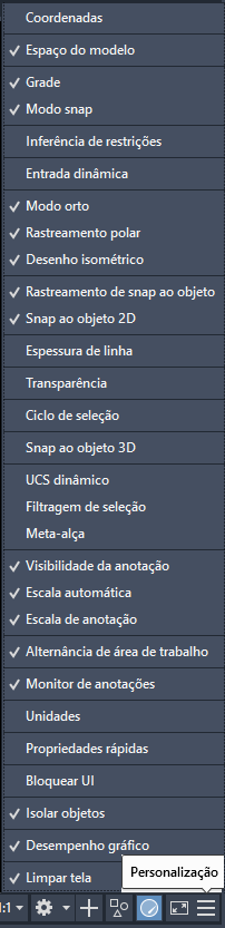 Para fechar o menu, clique em Personalização novamente ou clique na área de desenho.