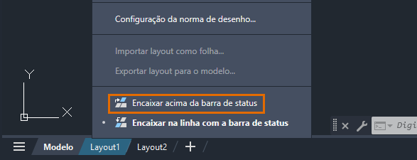 Clique com o botão direito do mouse na guia Modelo ou Layout e selecione Encaixar acima da barra de status ou Encaixar na linha com a barra de status.