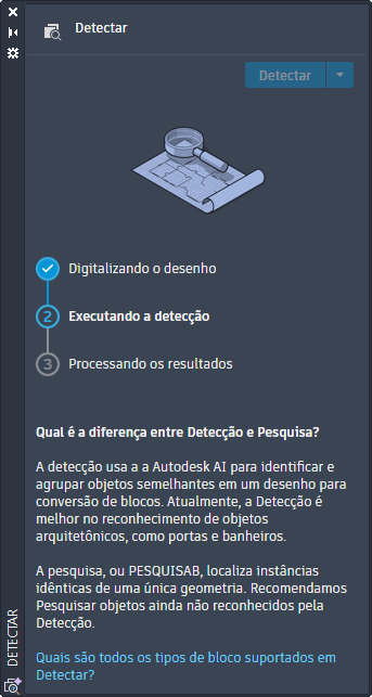 A paleta Detecção fornece opções para analisar o desenho e revisar os objetos identificados para conversão de bloco.