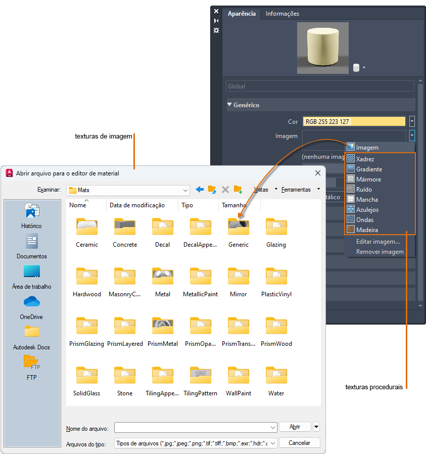 O produto fornece uma biblioteca de imagens que é possível utilizar com texturas. Você também pode adicionar suas próprias texturas com os seguintes tipos de arquivos: