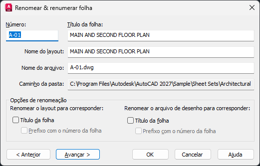 Quando selecionada, altera o nome do arquivo de desenho para corresponder ao título da folha.